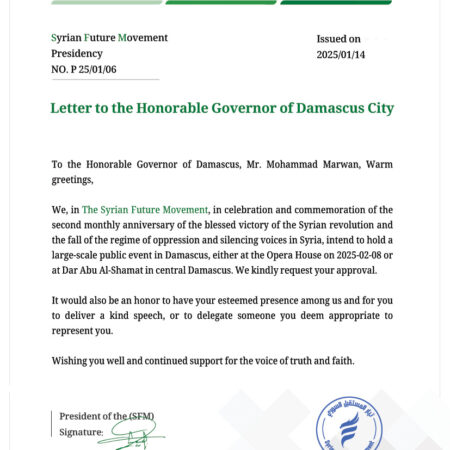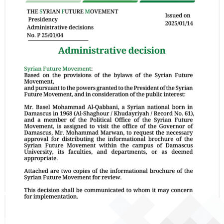 Details of Basil Mohammed Al-Qabbani's assignment to visit the Damascus Governor's office as part of the Syrian Future Movement.
