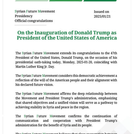 Donald Trump assumes the presidency, and the Syrian Future Movement looks forward to fruitful cooperation that ensures the stability of