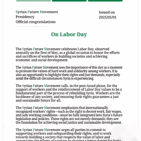 The SFM’s News: The Presidential Office of the Syrian Future Movement issued an official congratulatory message titled: On Labor Day.