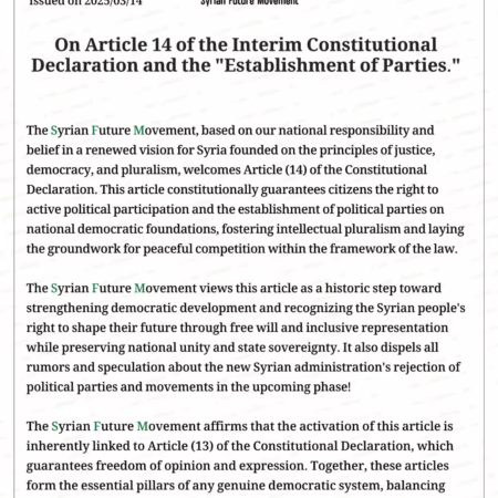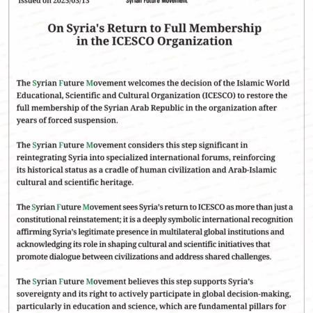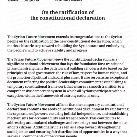 The SFM’s News: The Political Office for The Syrian Future Movement issued a Press release titled: On the ratification of