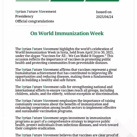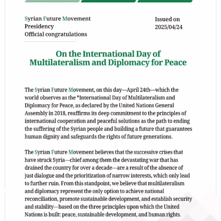 The SFM’s News: The Presidential Office of the Syrian Future Movement issued an official congratulatory statement titled: On the International