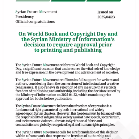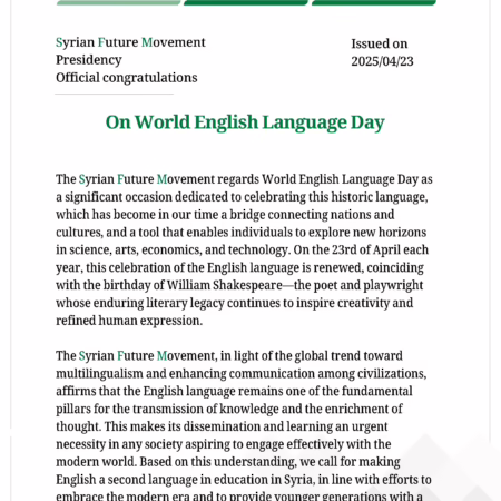 SFM News: The Presidency Office of the Syrian Future Movement issued an official statement titled: On World Earth Day. The