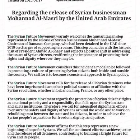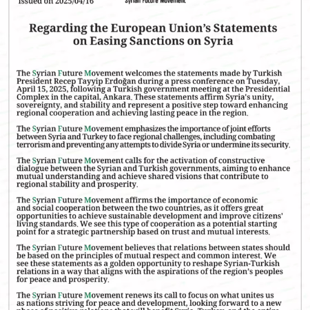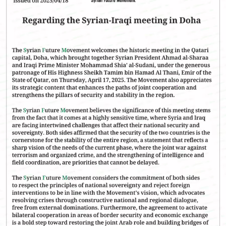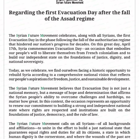 SFM’s News: The Presidency Office of the Syrian Future Movement published a statement titled: On the First Independence Day After
