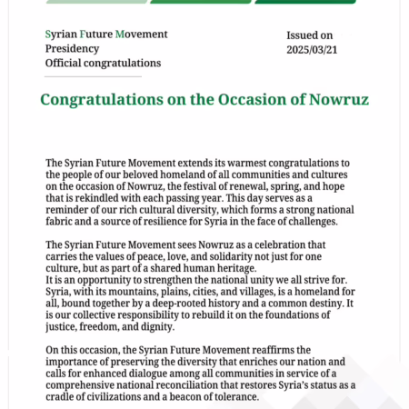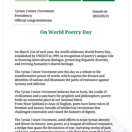 The SFM’s News: The presidency Office for The Syrian Future Movement issued a congratulatory message titled: On World Poetry Day.