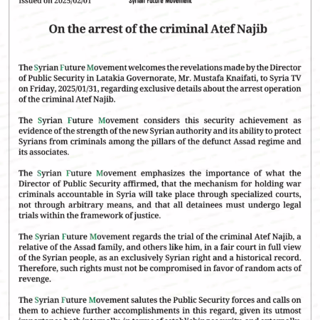 The Syrian Future Movement welcomes the Emir of Qatar’s visit to Syria.