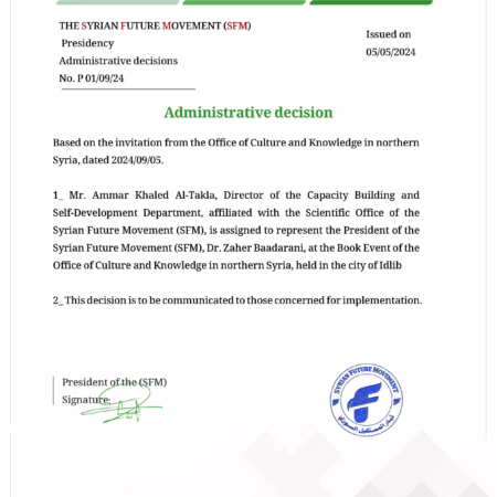 The SFM’s News: The Office of the Presidency of the Syrian Future Movement (SFM) issued a congratulatory statement titled: Congratulations