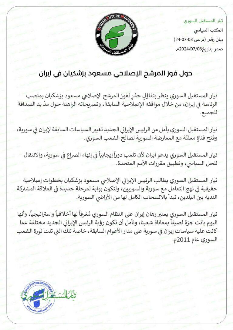 The Syrian Future Movement (SFM) looks with cautious optimism at the victory of the reformist candidate Masoud Bezkeshian in the