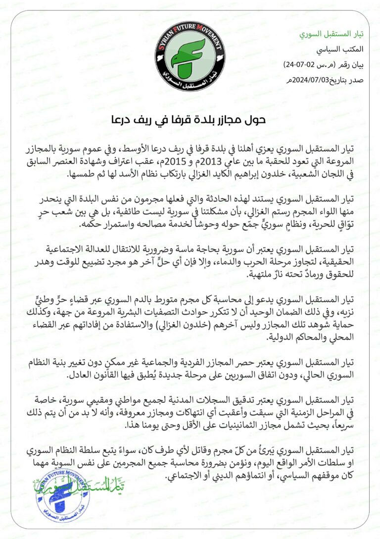 The Syrian Future Movement (SFM) expresses its condolences to our people in the town of Qarfa in rural Daraa, and