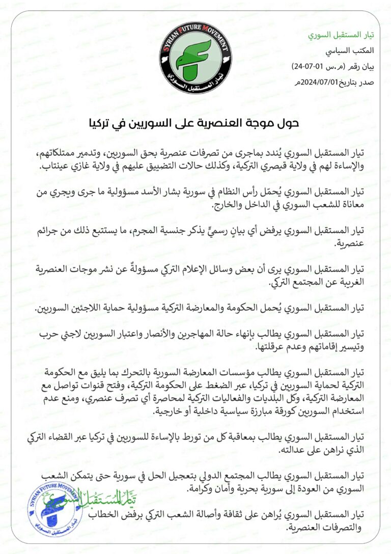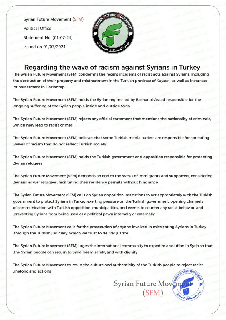 The Syrian Future Movement (SFM) condemns the recent incidents of racist acts against Syrians, including the destruction of their property