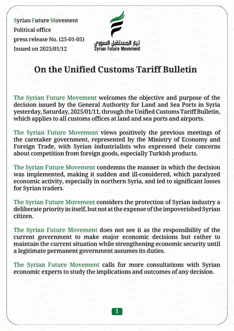 The Syrian Future Movement welcomes the announcement of the dissolution of the Insurance Companies Union as a step towards strengthening