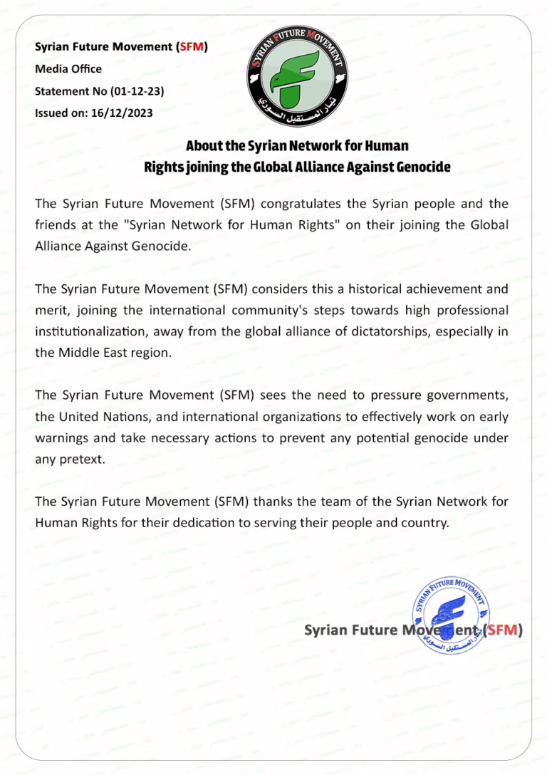 (SFM) News:The Media Office of the Syrian Future Movement (SFM) released a statement about the Syrian Network for Human Rights