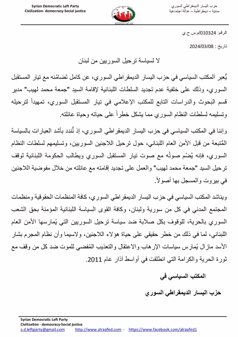 The Democratic Left Party issues a statement in solidarity with the Syrian Future Movement’s statement to prevent the deportation of Jumaa Mohamed Laheeb from Lebanon
