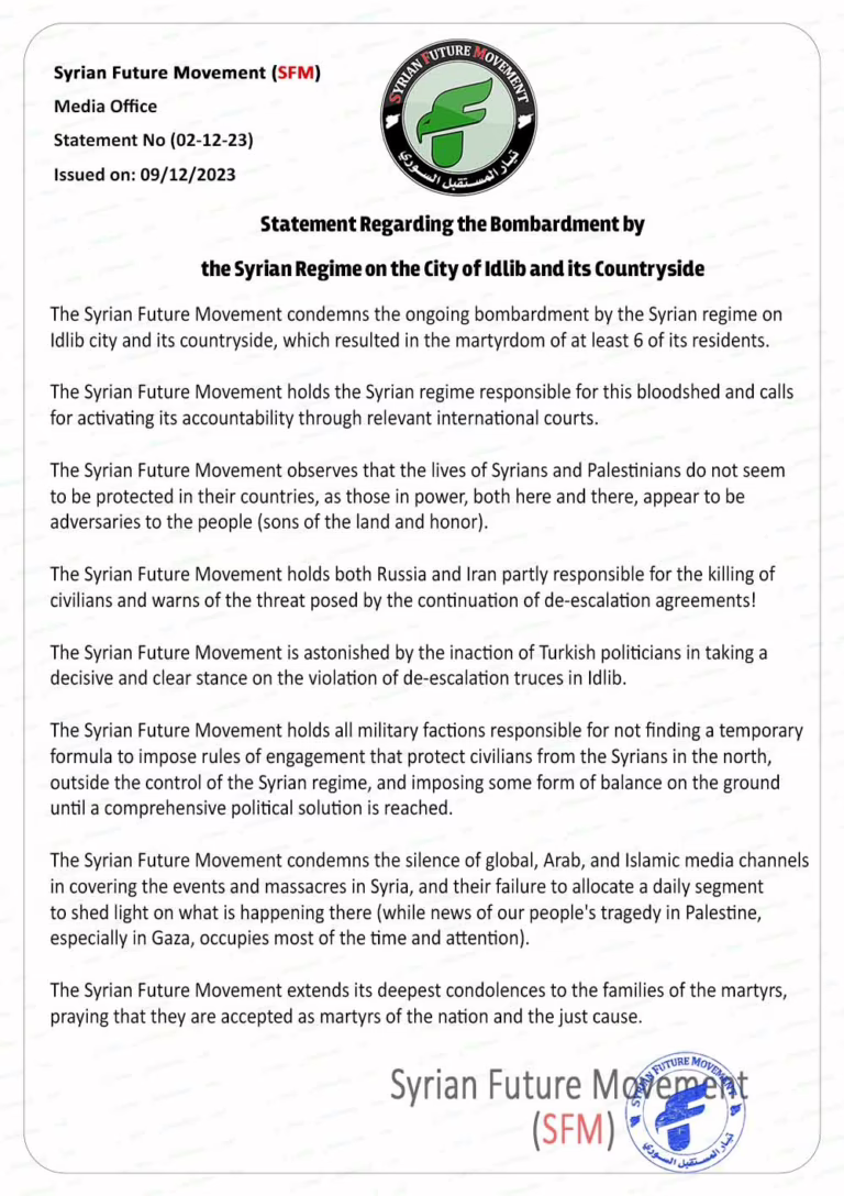 (SFM) News:The Political Office of the Syrian Future Movement issued a statement condemning the Syrian regime’s bombardment of Idlib and