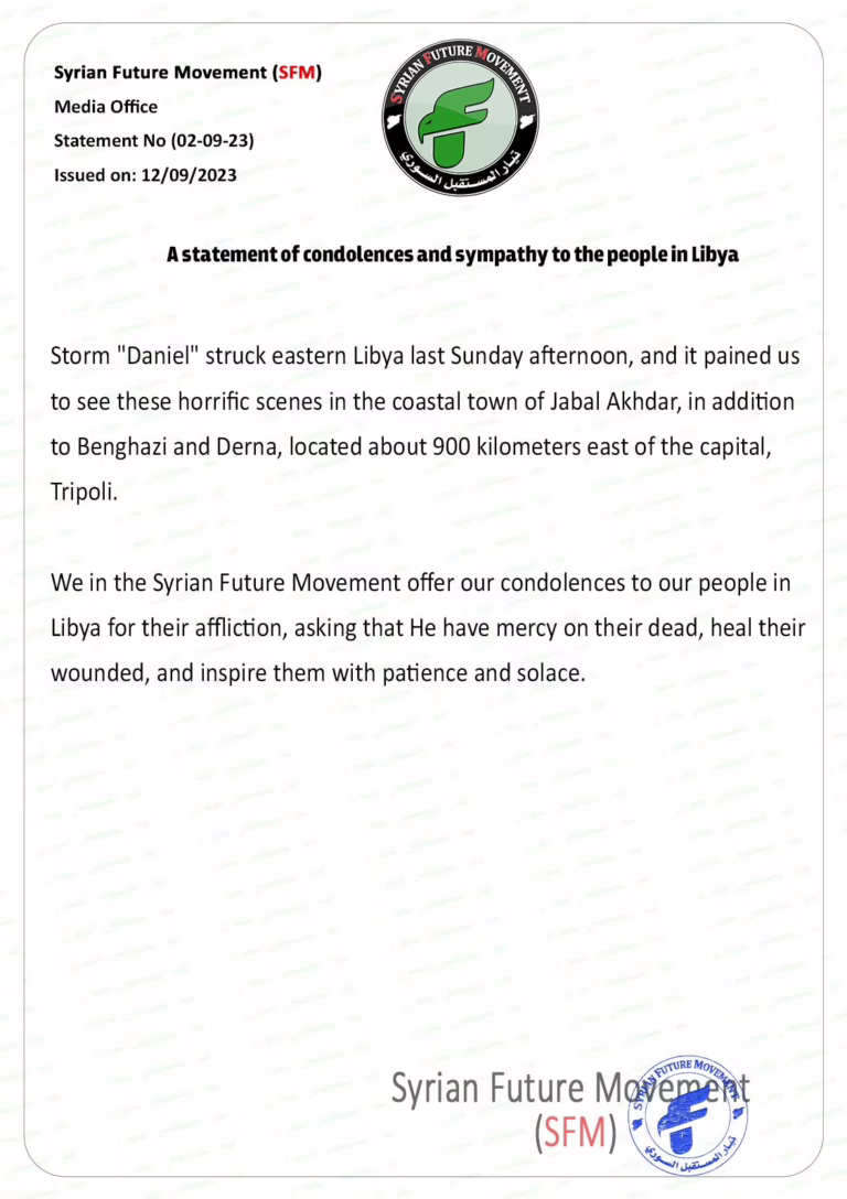 A statement of condolence and sympathy to our people in Libya. The Syrian Future Movement expresses its sorrow for the