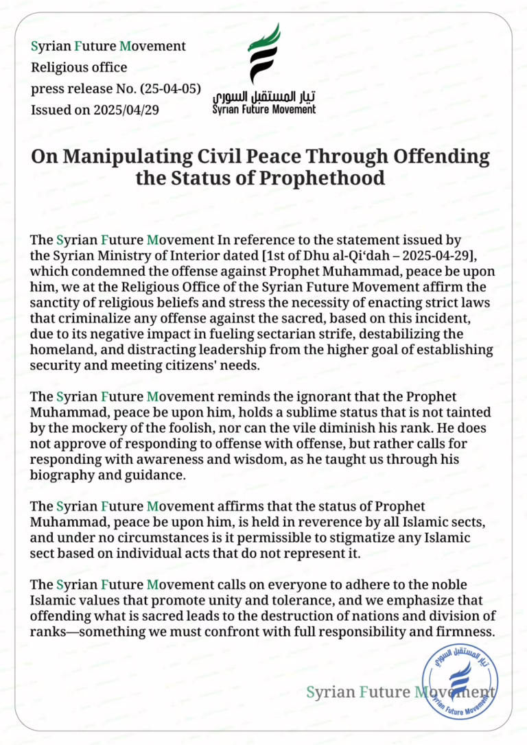 The SFM’s News: The Religious Office of the Syrian Future Movement issued a statement titled: On Undermining Civil Peace through