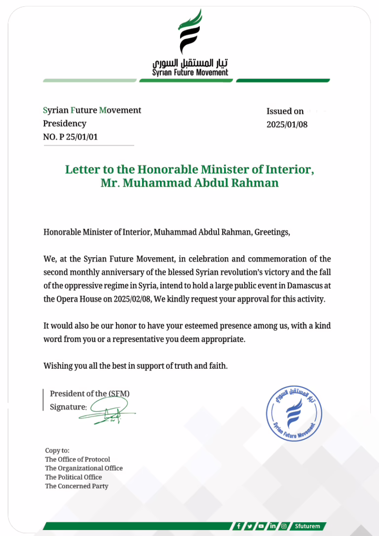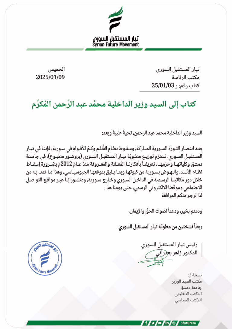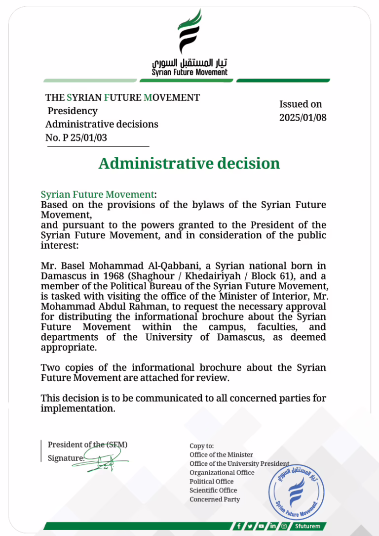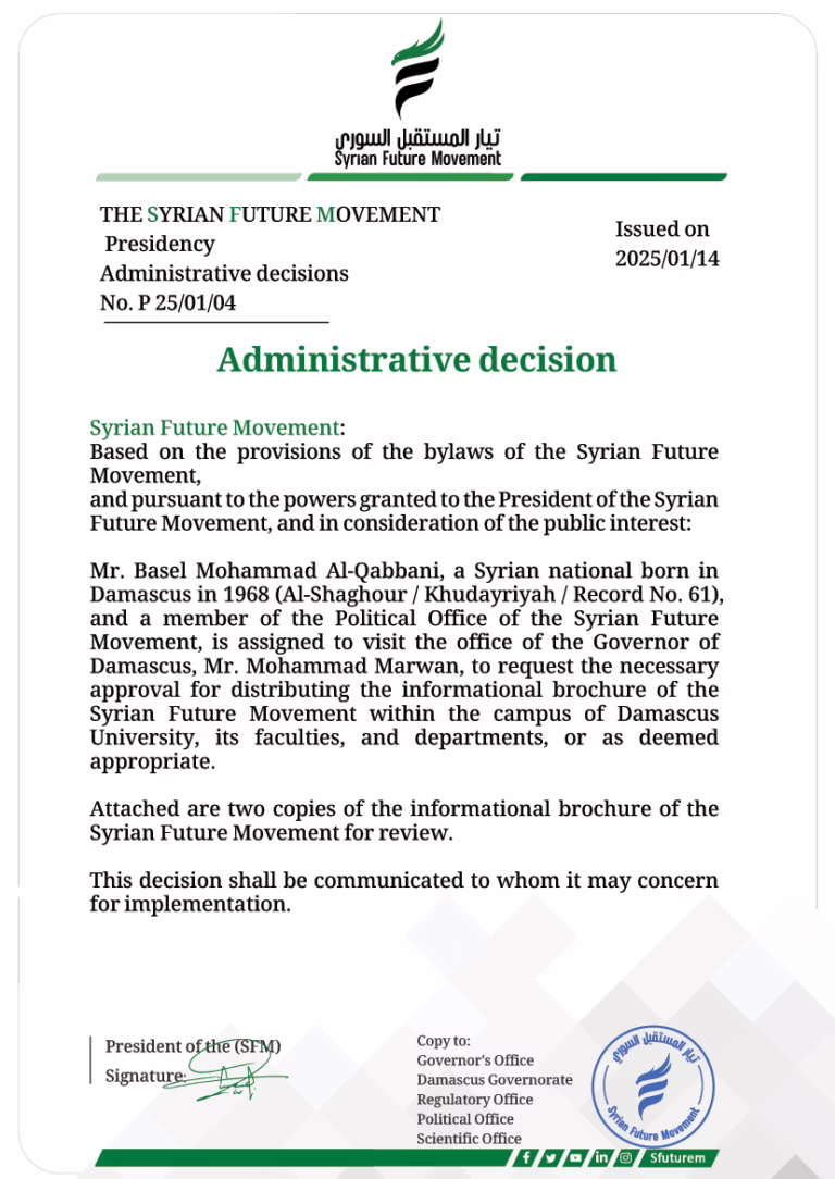Details of an important administrative decision by the Syrian Future Movement regarding the appointment of Mr. Jumaa Muhammad Lahib.