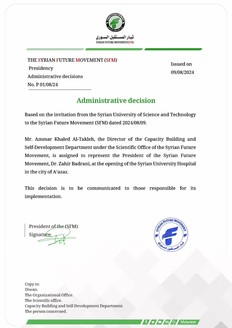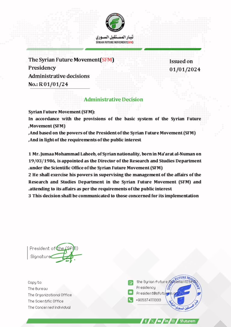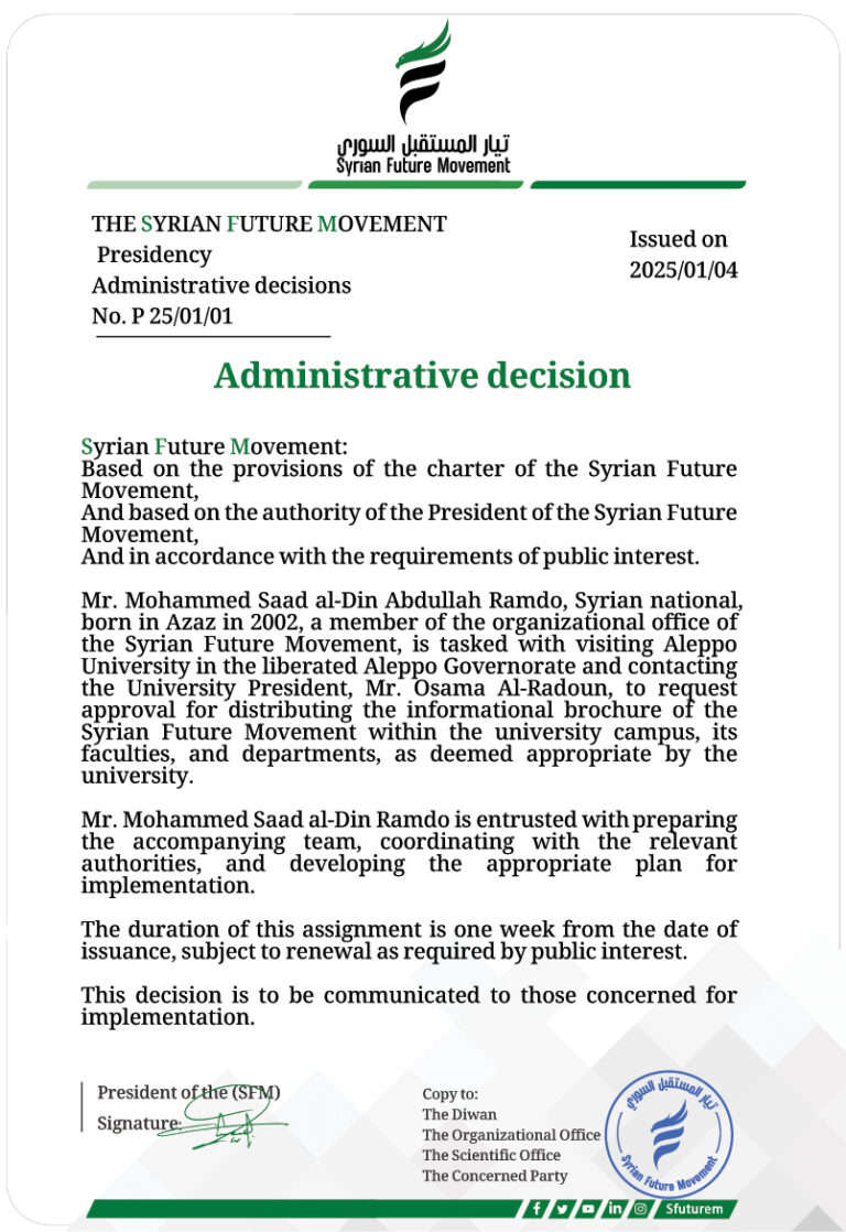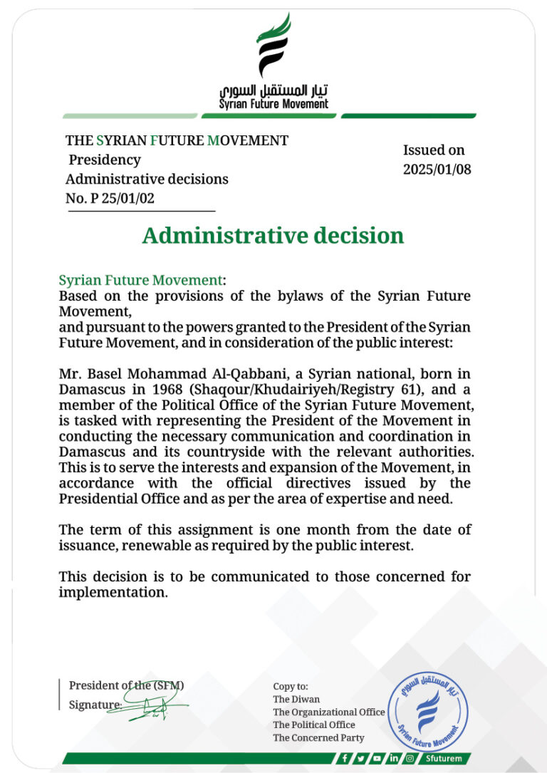 Administrative Decision Syrian Future Movement:Based on the provisions of the bylaws of the Syrian Future Movement,and pursuant to the powers