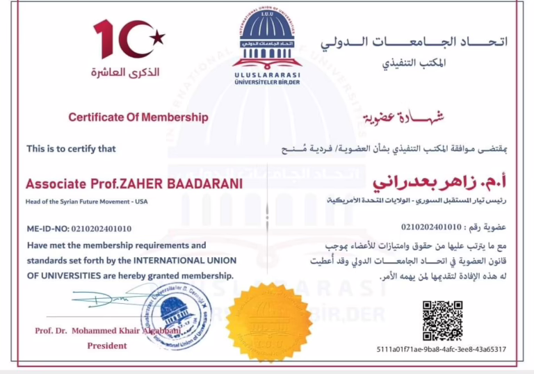 Granting the President of the Syrian Future Movement a membership certificate in the International Union of Universities and its importance.