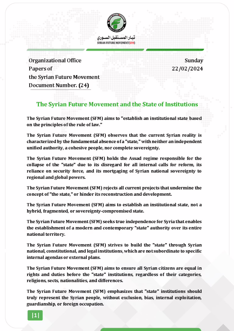 The Syrian Future Movement's vision of the role of the institutional state in Syrian society.