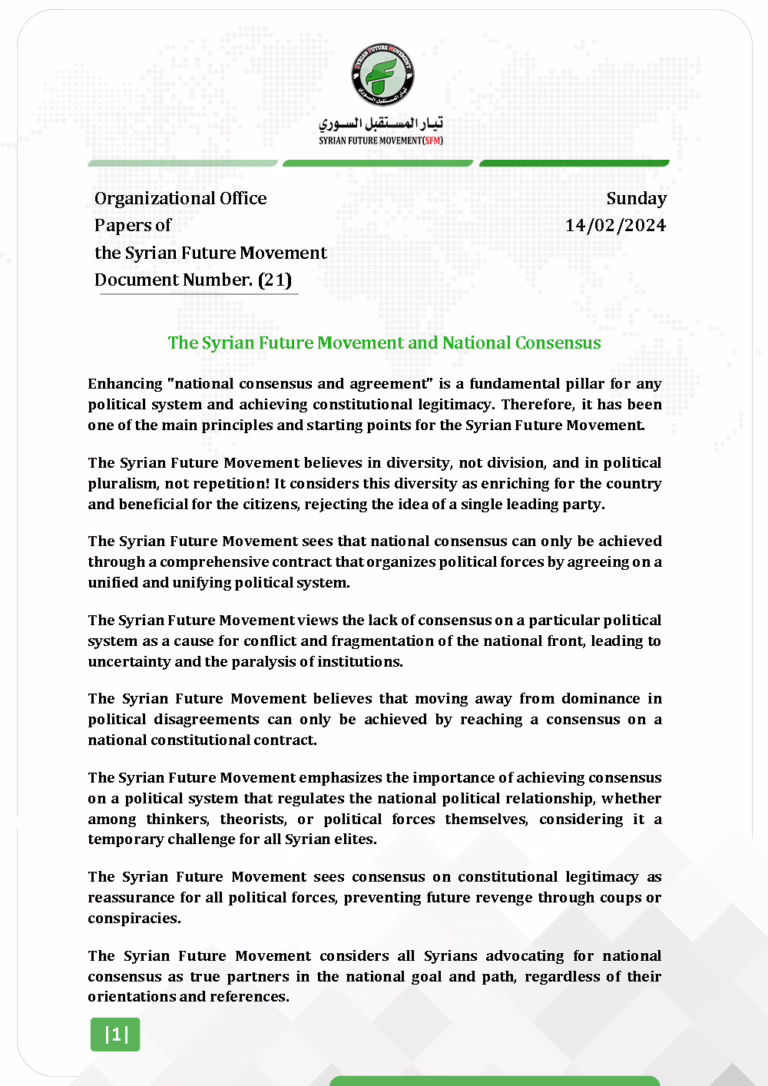 The Syrian Future Movement's vision is to promote national consensus and avoid conflicts among political forces.