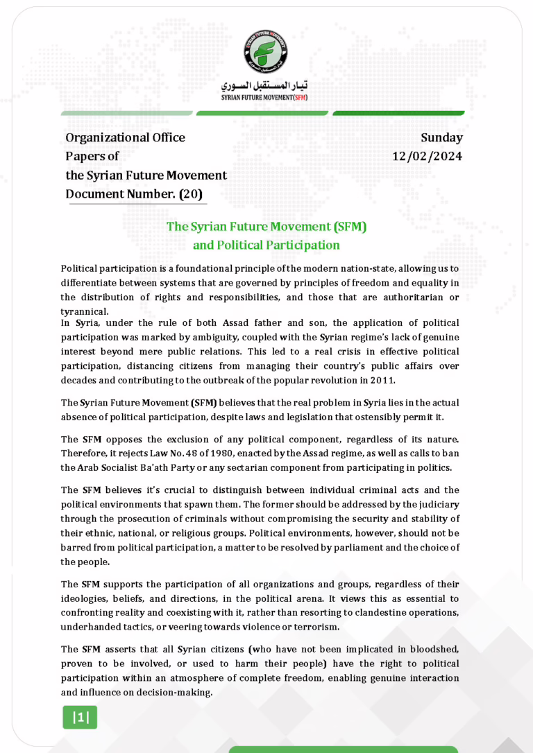 The Syrian Future Movement's vision of political participation, which is the foundation for freedom and equality in the nation-state.