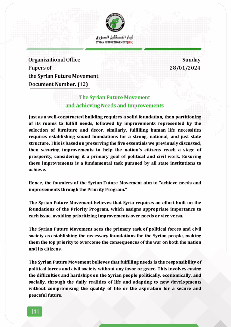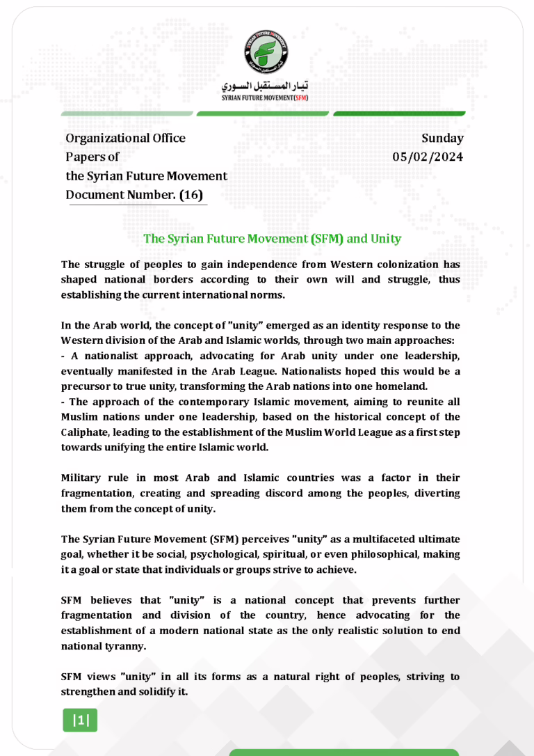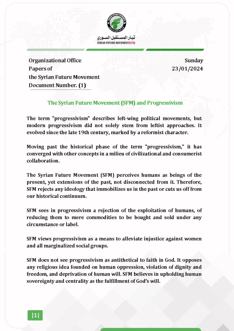 The Syrian Future Movement views progress as a universal human vision that is not limited to one race or another,