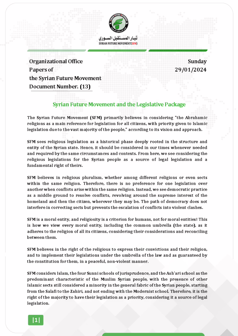 The Syrian Future Movement's vision of religious legislation as a primary source for building the Syrian state.
