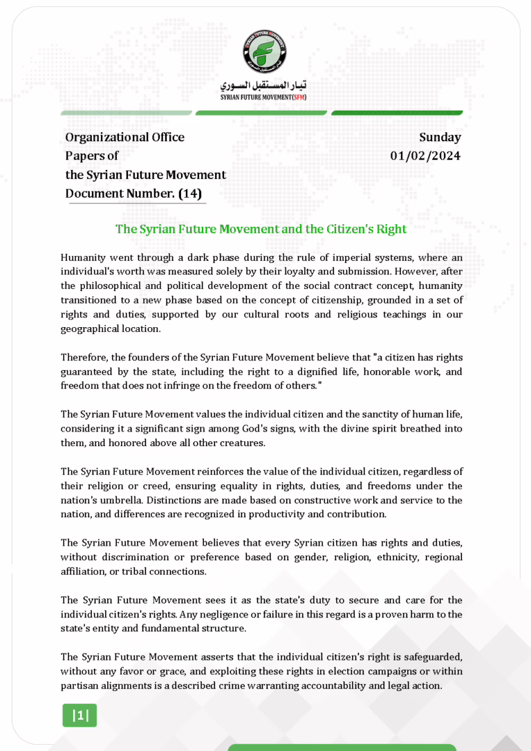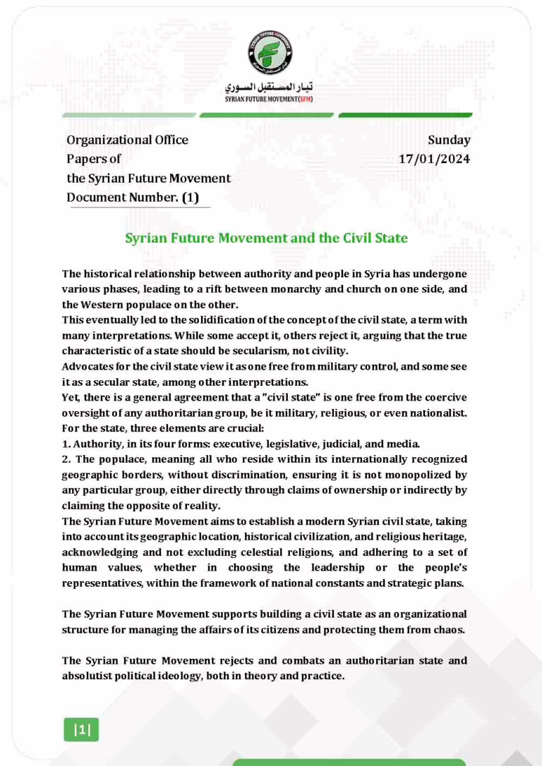 The Syrian Future Movement believes that a civil state is based on constitutional legitimacy, through a voluntary contract between the