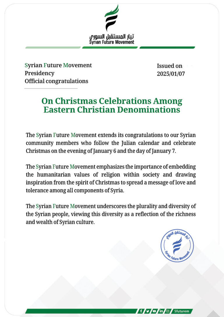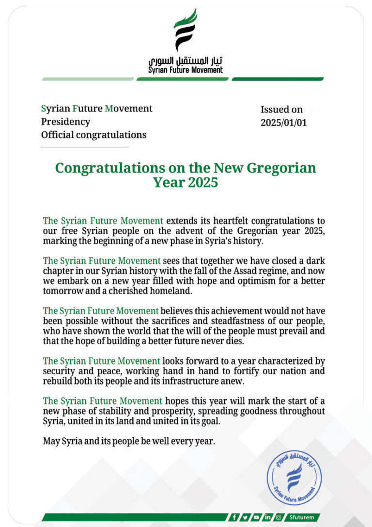 In the new year, the Syrian Future Movement celebrates the achievements of the people and looks forward to a year