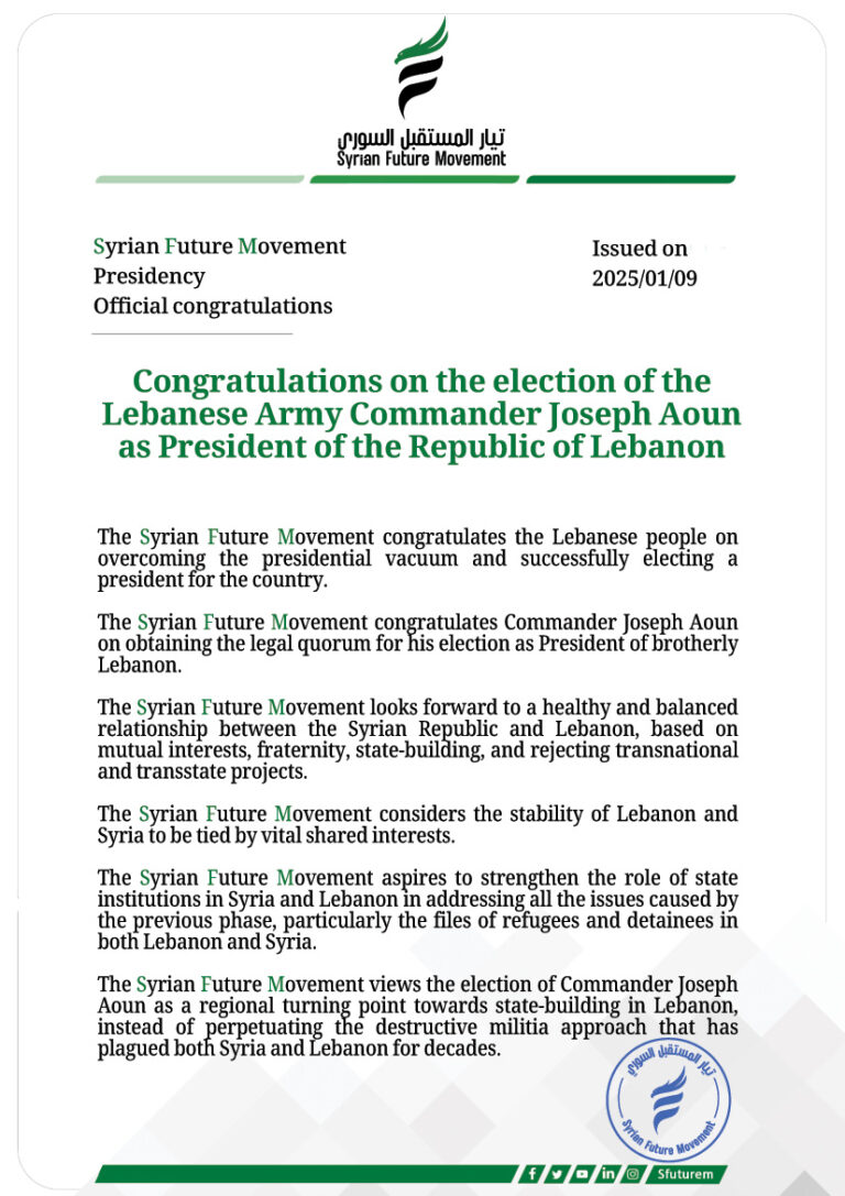 The Syrian Future Movement congratulates Joseph Aoun on his election as President of Lebanon and calls for strengthening relations between