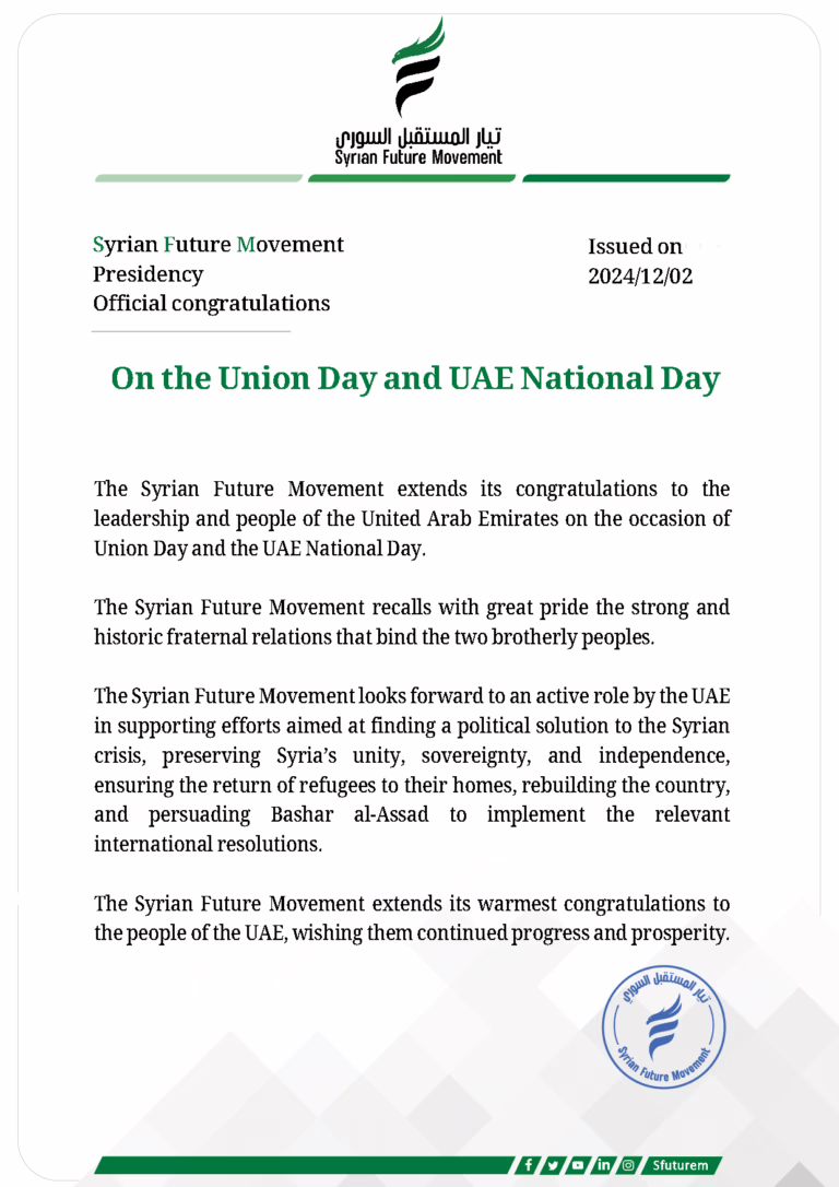 Congratulating the Syrian Future Movement on the occasion of UAE National Day and Union Day, emphasizing fraternal relations.