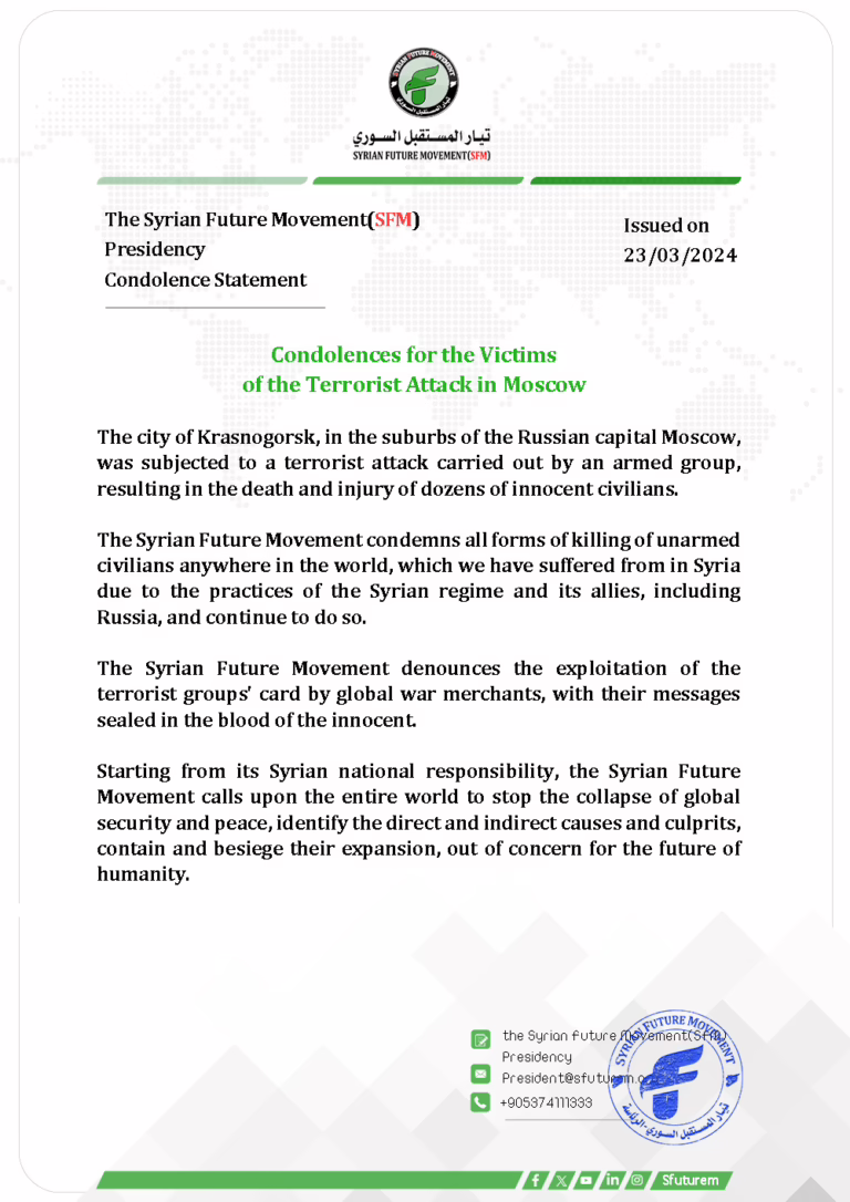 The Syrian Future Movement, based on its Syrian national responsibility, calls on the entire world to stop the collapse of