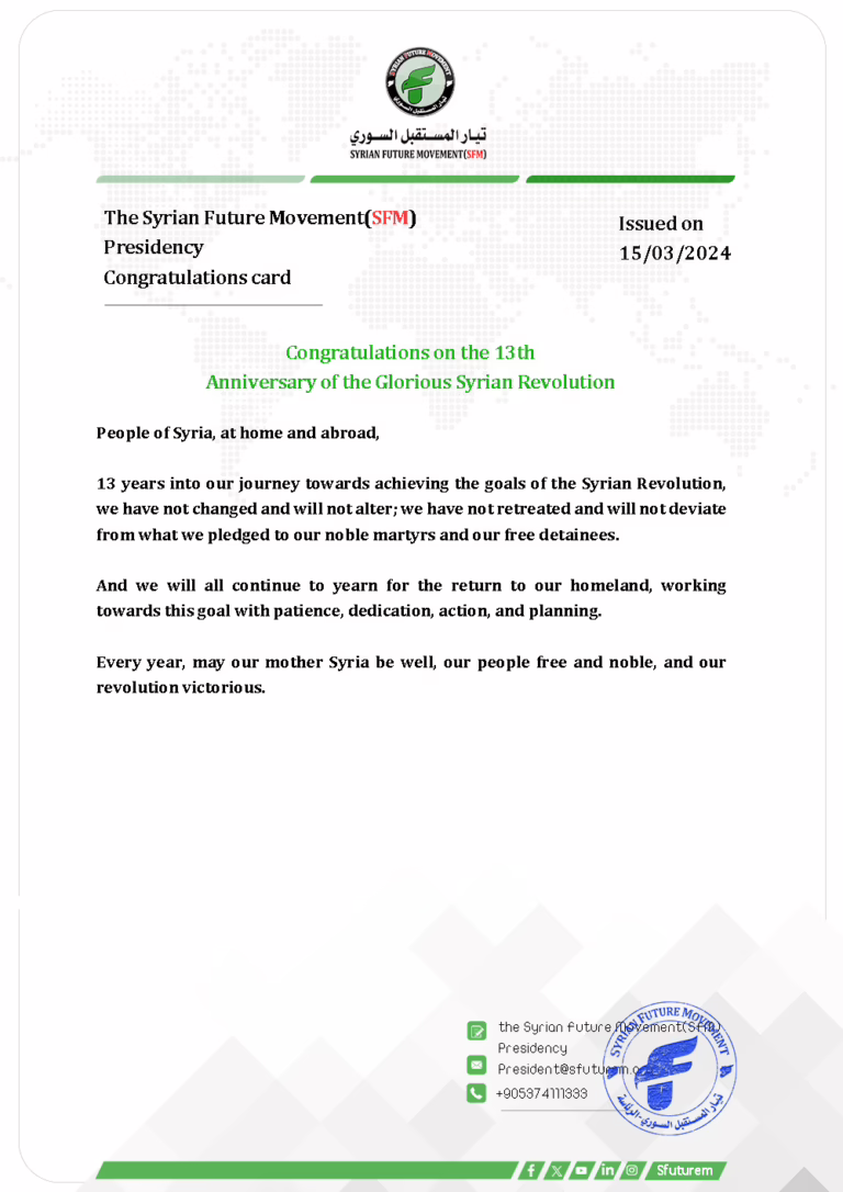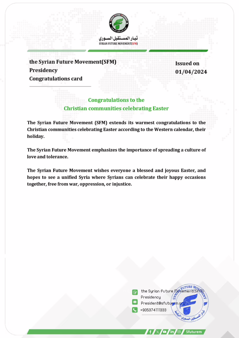 The Syrian Future Movement extends to you heartfelt congratulations and blessings on the occasion of the joyful Eid al-Fitr.
