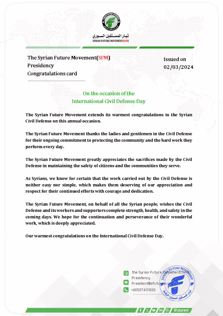 The Syrian Future Movement extends its best wishes on the occasion of International Civil Defense Day, in appreciation of their