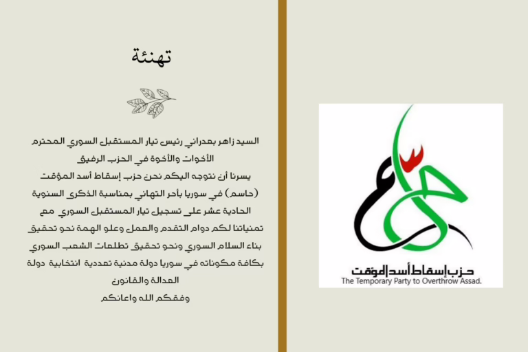 The Temporary Overthrow of Assad Party (HASEM) in Syria extends its warmest congratulations on the eleventh anniversary of the registration