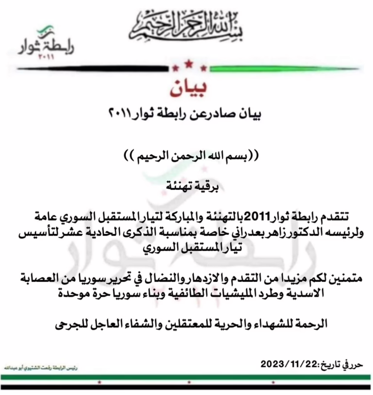 The 2011 Revolutionaries League extends its congratulations and blessings to the Syrian Future Movement in general and its leader, Dr.