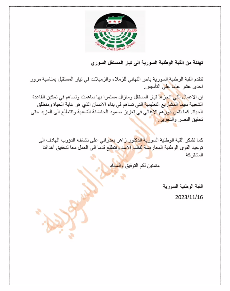 Congratulations from the Syrian National Dome to the Syrian Future Movement (SFM)