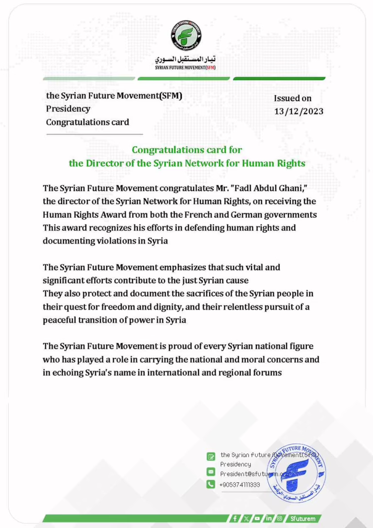 The Syrian Future Movement congratulates Mr. Fadel Abdul Ghani, Director of the Syrian Network for Human Rights, on receiving the