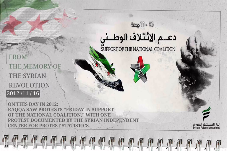 What happened in the Syrian revolution on this day in 2012: Demonstrations in Raqqa in support of the National Coalition.