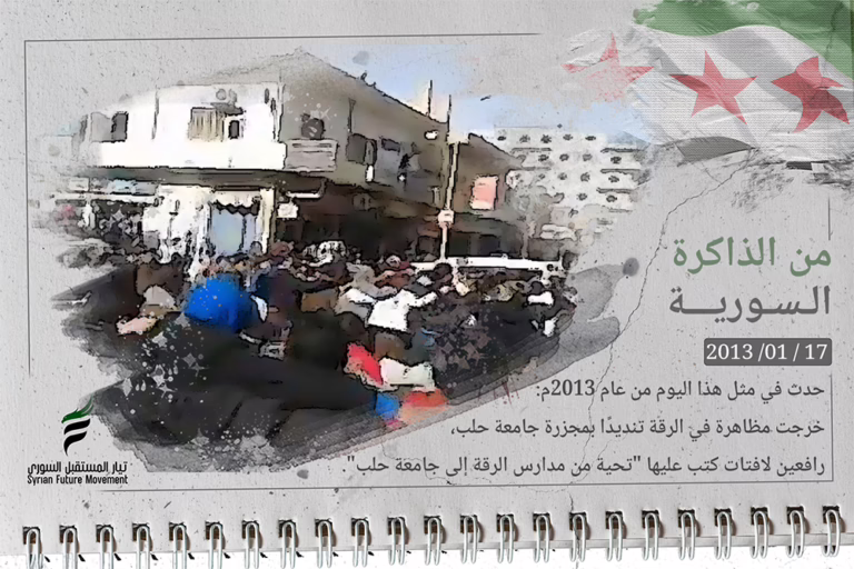 Syrian Revolution protests highlight the 2013 Tal Abyad demonstration commemorating the Aleppo University massacre.
