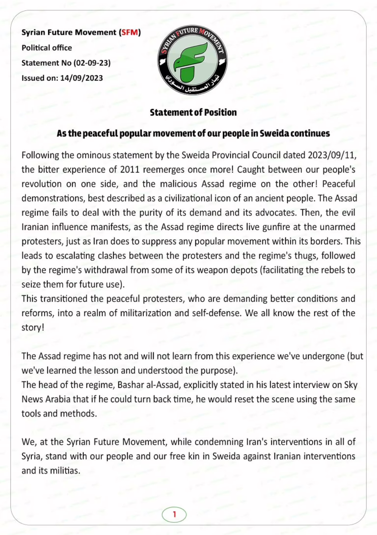Statement of Position As the peaceful popular movement of our people in Sweida continues