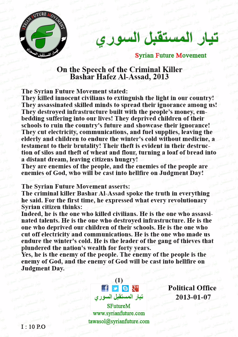 The Syrian Future Movement...strongly condemns the insults that the so-called (President) launched against his people when he said about them: