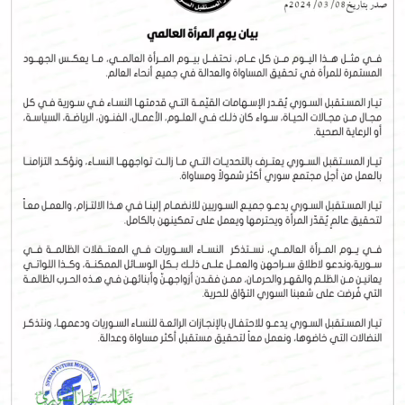 تيار المستقبل السوري وانطلاقاً من مسؤوليته الوطنية السورية، يدعو العالم أجمع لوقف انهيار الأمن والسِّلم العالميين