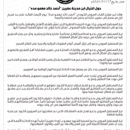تيار المستقبل السوري يدين اغتيال أحمد خالد معمو مدة وندعو لمحاكمة عادلة وسريعة للقاتل لحماية السلم الأهلي في عفرين.