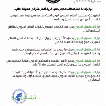 تيار المستقبل السوري يعبر عنإدانة استهداف مدرس في قرية آفس بيد نظام الأسد ويطالب بحماية المدنيين.