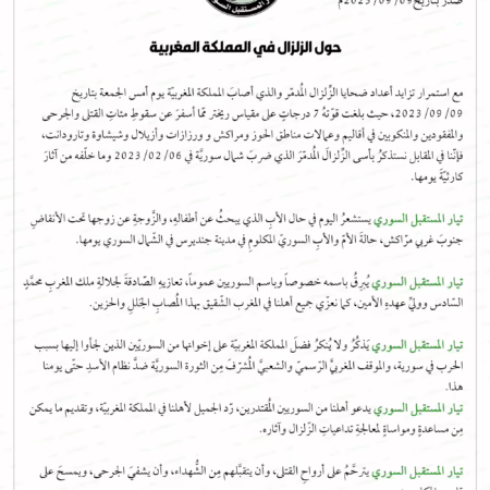 تيار المستقبل السوري يترحَّمُ على أرواحِ القتلى، وأن يتقبَّلهم مِن الشُّهداء، وأن يشفيَ الجرحى، ويمسحَ على قلوب المكلومين.
