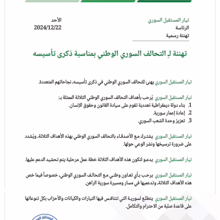 تهنئة لـِ التحالف السوري الوطني بمناسبة ذكرى تأسيسه