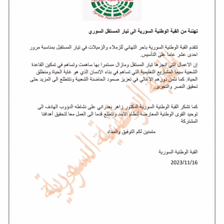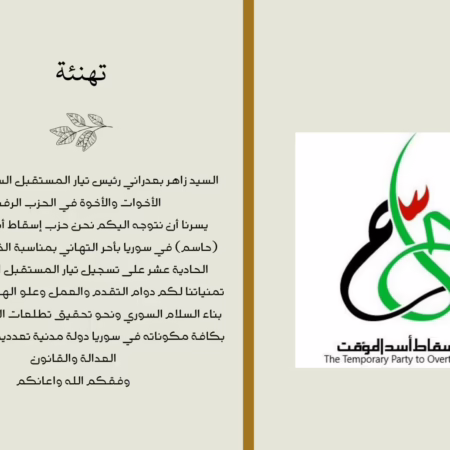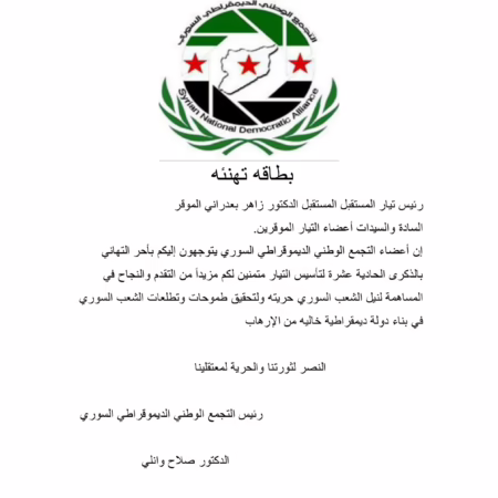 تهنئة من التجمع الوطني الديموقراطي السوري لـِ تيار المستقبل السوري