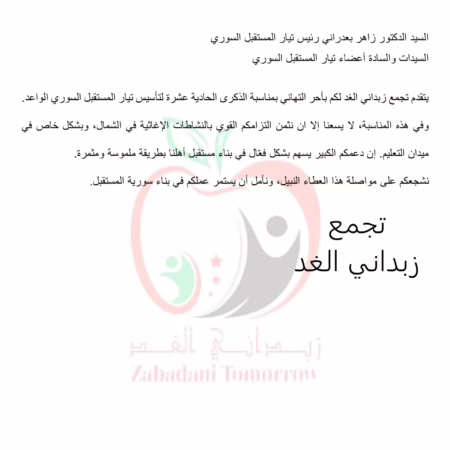 تهنئة من زبداني الغد لـِ تيار المستقبل السوري
