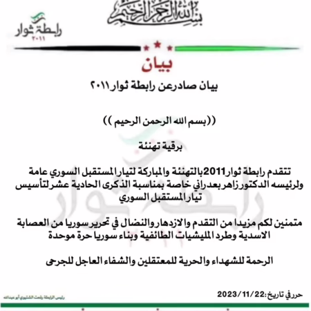 تهنئة من رابطة ثوار 2011 لـِ تيار المستقبل السوري